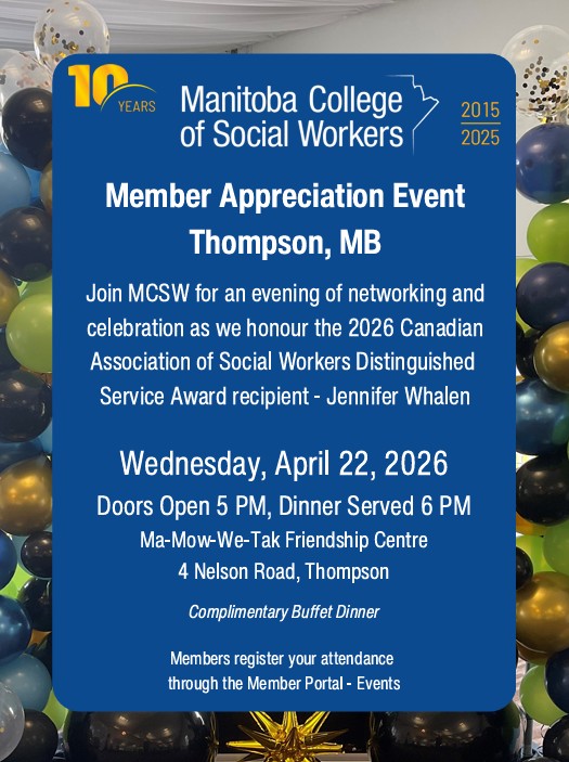 Northern members: Celebrate Social Work Month! Gather your fellow members and join the MCSW Board and staff representatives for a fun evening of networking and honouring 2026’s CASW Distinguished Service Award Recipient!
